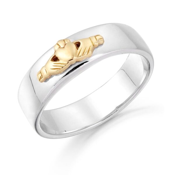 Great style of Claddagh Wedding Ring! Unique and stylish Wedding Band for ladies and men. Signature Collection. Also available to buy in Two tone, all yellow or all white Gold. Made from 9K Gold and 6mm wide. Hand made in Ireland and matching set available to buy in his & her size to present each other on their Wedding day! Celebrate your most special day with this modern and timeless and Unisex Irish Ring. Large selection of Claddagh Jewellery available to buy. Ancient design of Celtic combined with Claddagh which gives a modern twist. Furthermore, our Luxurious Wedding Band is designed to be the perfect beginning of your romantic journey together Featuring an understated yet distinctive design.