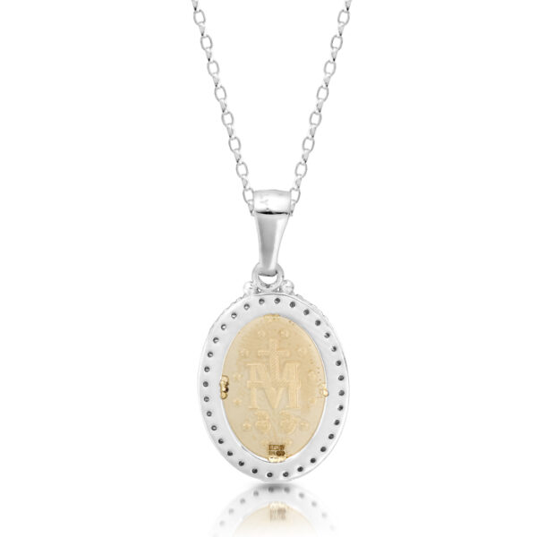 This 9ct Gold Miraculous Medal Pendant made in Ireland and crafted from 9K Gold. Also, Irish Jeweller further enhanced this medal with Diamond cut edge. Moreover, this Medal Pendant made in Ireland and crafted from 9K Gold. The oval-shaped medallion is beautifully studded with CZ surround, adding a touch of sophistication and divine charm. The Medal of the Immaculate Conception, popularly known as Catholics the world over as the Miraculous Medal. The front of the medal depicts Mary standing on a globe, with the head of a serpent beneath her feet. The left heart, circled with thorns, represents Jesus. The right heart, pierced by a sword, symbolizes Mary.