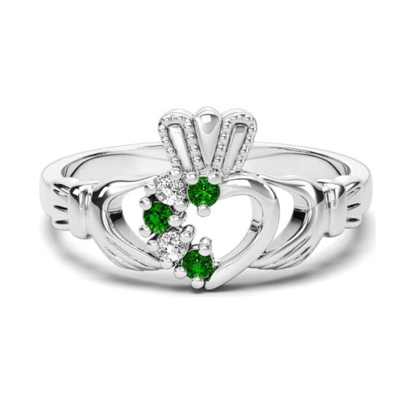 Also Irish Gemstone Claddagh Dress Ring known as most culturally rich pieces of Irish Jewelry that history ever recorded. Claddagh, a heart encircled with pair of delicate hands and with Crown above Heart. Moreover, Hands of Silver Claddagh Ring symbolize friendship, Heart represent Love, and Crown represent loyalty. Traditional Claddagh design, streamlined and simplified but meaning and sentiment remain the same. Irish Promise Ring with modern gleam of Synthetic Emerald and Cubic Zirconia. Free and Fast Worldwide Delivery. Unbeatable Prices. Best Quality Craftsmanship. Excellent Customer Service.