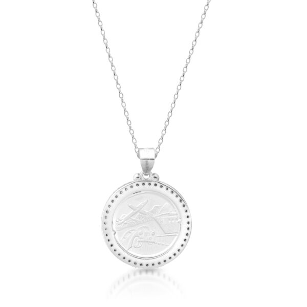 Silver Saint Christopher Medal made in Ireland studded with CZ stones. The one-time Catholic patron saint of travellers and commonly worn as a Pendant especially by travellers, to show devotion and as a request for his blessing. St. Christopher is a widely popular saint, especially revered by athletes and travellers. He holds patronage of things related to travel and travellers against Lightning and Pestilence, Boatman, Soldiers etc. Christopher is the patron saint of many places. Because St. Christopher offered protection to travellers and against sudden death, many churches placed images or statues of him, usually opposite the south door, so he could be easily seen. He is usually depicted as a giant of a man, with a child on his shoulder and a staff in one hand. The reverse side of the medal showcases a beautifully etched travel motif, including an airplane, train, ship, and car—making it the perfect gift for frequent travelers or loved ones embarking on a journey.